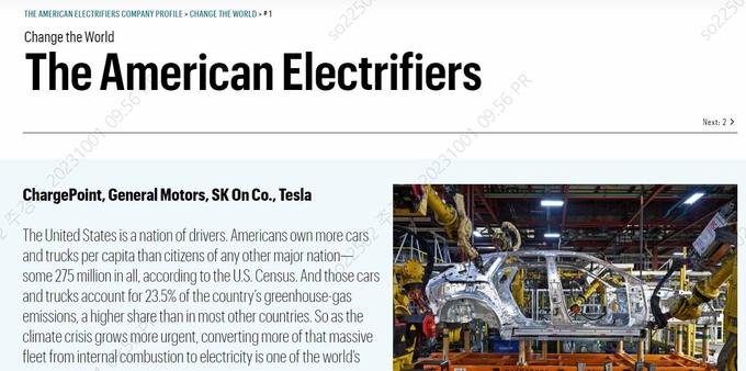 포춘은 지난달 27일 (현지시간) ‘2023 세상을 바꾸는 혁신기업’ 명단을 공개하고 SK온을 완성차 회사인 테슬라(Tesla), 제너럴 모터스(General Motors), 전기차 충전소 기업인 차지포인트(ChargePoint)와 함께 ‘미국의 전동화를 이끄는 자들’(The American Electrifiers)이라 칭하며 공동 1위에 선정했다.