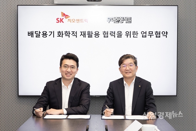 SK지오센트릭은 우아한형제들과 6일 서울 종로구 SK그린캠퍼스(종로타워빌딩)에서 ‘배달용기의 화학적 재활용 협력을 위한 업무협약(MOU)’을 체결했다. 두 회사는 화학적 플라스틱 재활용 기술의 경제성을 높이고 친환경 배달 문화를 만들고자, 재활용이 쉬운 배달용기의 개발 및 보급, 플라스틱 배달용기 시장의 순환체계 구축에 뜻을 모았다.