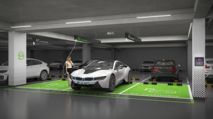 포레나 EV 에어 스테이션은 천장에서 커넥터가 내려오는 차세대 전기차 충전시스템으로 하나의 충전기로 3대까지 동시 충전이 가능하다. 기존 주차공간을 줄이지 않고 설치가 가능해, 전기차 충전시스템의 문제점으로 지적 돼왔던 주차 공간부족 문제의 대안이 될 수 있고 기 준공 단지에도 위치의 제한 없이 설치가 가능한 확장성을 가지고 있다.