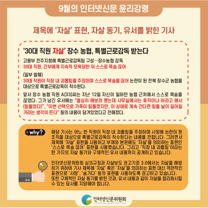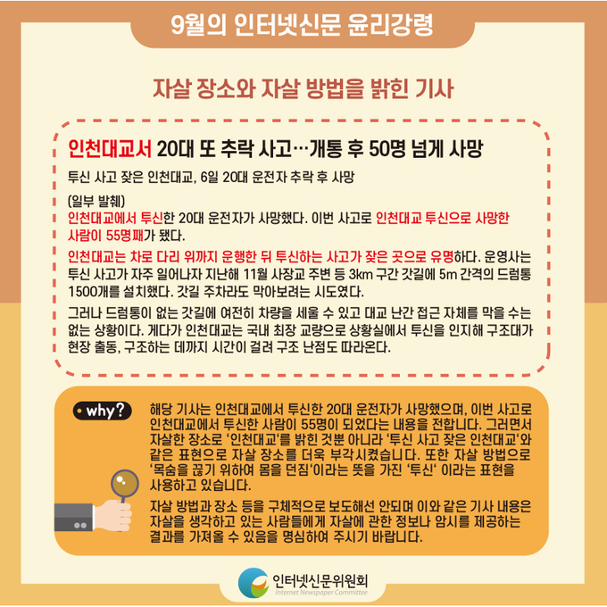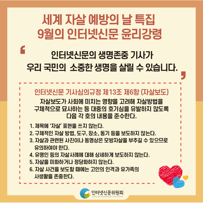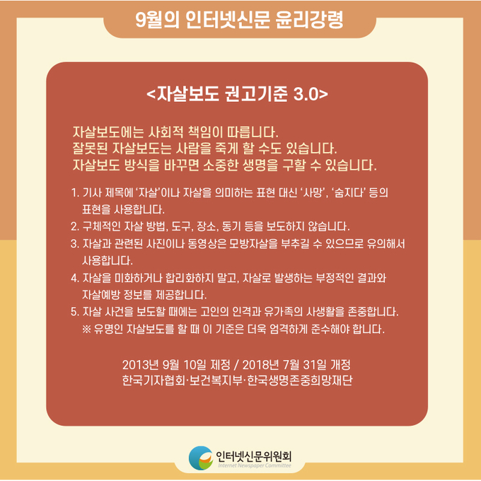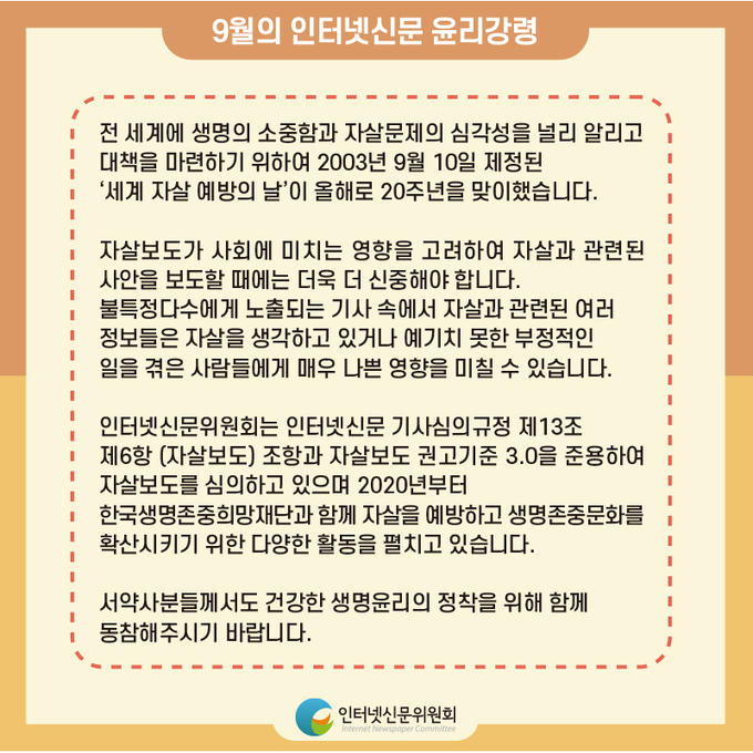 또한 인신위는 매월 850여개 자율심의 참여서약사에게 배포하는 이달의 윤리강령 주제를 ‘세계 자살예방의 날 특집’으로 선정하여 자살보도와 관련된 인터넷신문 기사심의규정, 자살보도 권고기준 3.0 및 관련 핵심내용을 카드뉴스 형태로 제작해 배포했다.