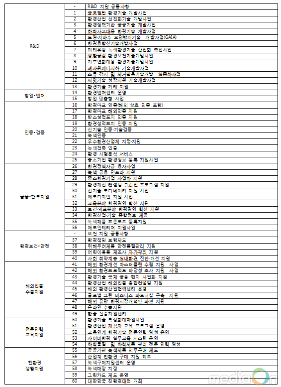 이번 기업지원제도 종합안내서는 환경기술 연구개발(R&D), 창업‧벤처기업, 인증․검증, 금융‧판로 지원, 환경보건․안전, 해외진출 수출지원, 전문인력 교육, 친환경생활 지원 등 총 8개 분야를 아우른다.