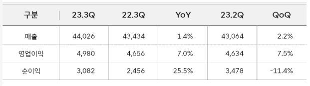 SK텔레콤 2023년 3분기 경영실적 (억 원)