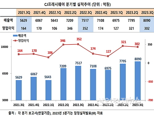 CJ프레시웨이가 최근 공시한 잠정실적 IR자료에 따르면 연결재무제표기준 올 3분기 매출은 약 8090억, 영업이익 302억 원을 시현, 지난해 3분기 매출 7517억 대비 약 573억이 늘어 7.6% 증가했지만, 영업이익은 302억 원에 그쳐 전년 동기 352억 대비 약 14.2% 감소했다.