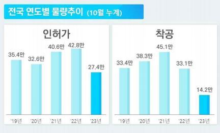 [엔트로피타임즈 문성희 기자] 주택공급이 크게 줄고 있는 것으로 조사됐다. 국토교통부가 매월 집계하는 주택통계자료에 따르면 올해 1월~10월 주택 인허가 건수는 27.4만 건으로 작년 42.8만 건에 비해 36.0%나 적었다. 최근 5년 인허가 가운데 가장 적은 물량이다.
