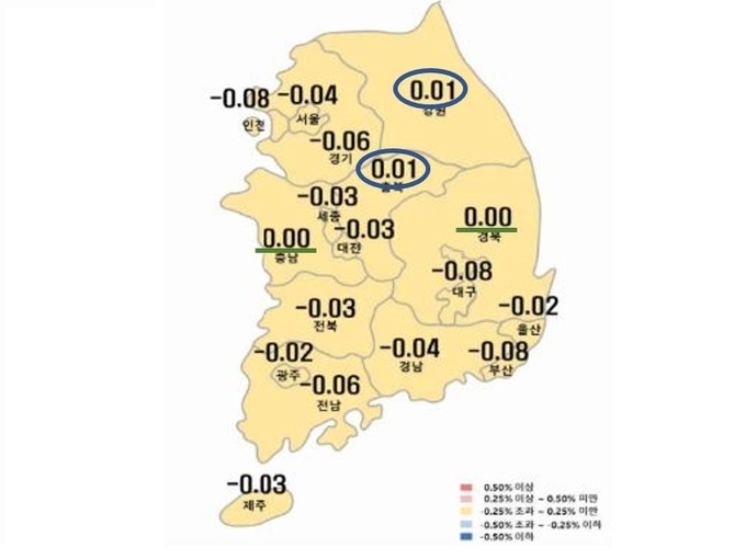 지난주 주택가격 추이를 전국적으로 살펴보면, 강원과 충북이 0.01%로 간신히 상승세를 유지하고, 충남과 경북이 보합으로 하락세를 면했을 뿐 그외 전국 모든 곳이 하락세를 보였다.