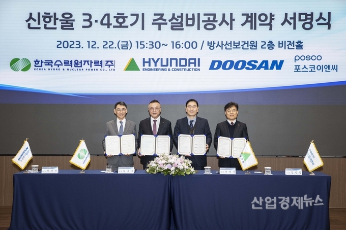 현대건설은 지난 22일(금) 서울시 중구에 위치한 방사선보건원에서 윤영준 현대건설 사장, 황주호 한국수력원자력 사장과 컨소시엄 관계자들이 참석한 가운데 총 3조 1천억 원 규모의 신한울 3·4호기 원자력발전소 주설비 공사의 계약 서명식을 가졌다.