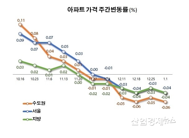 한국부동산원에 따르면 올해 1월 1일 기준, 전국 아파트가격 변동률은 -0.05%로 조사됐다. 지난해 9월만 해도 +0.10%의 변동률을 보이며 상승세를 높였던 가격 추이가 10월부터 축소되기 시작하더니 11월말부터는 하락세로 전환됐다.