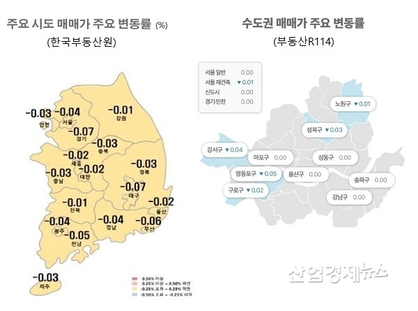 하지만, 실거래가격 위주로 통계를 작성하고 있는 한국부동산원은 지난주 서울 -0.04%, 경기 -0.07%, 인천 -0.03%로 매매가격이 계속 하락하고 있는 수치를 내놨다.