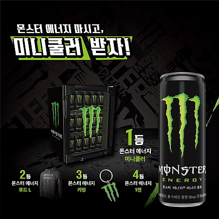 아울러 이번 이벤트의 1등 당첨자를 위해 ▲몬스터 에너지를 더욱 시원하게 즐길 수 있는 ‘미니쿨러’를 준비했다. 외관의 몬스터 에너지의 로고가 인상적인 미니쿨러는 브랜드 아이덴티티가 잘 드러나는 아이템으로, 인테리어 소품으로도 활용 가치가 높아 팬들 사이에서도 유독 인기가 많은 굿즈 중 하나다.