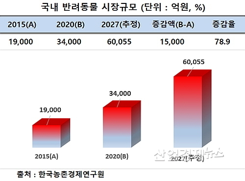 또 한국농촌경제연구원의 최근 조사에 따르면 국내 반려동물 시장 규모는 2015년 1조9000억 원에서 2020년 3조4000억 원으로 5년간 78.9% 성장했으며 오는 2027년에는 6조55억 원 규모로 커질 것으로 전망됐으며, 국내 반려동물 관련 산업 역시 연평균 14.5%씩 성장 중이다.
