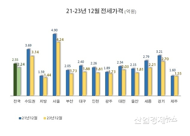 매매가격과 함께 전세가격도 지난 2년 동안 변화가 심했다. 2023년 12월 전국 평균 전세가격은 2.24억원으로 2년 전 2021년 12월 2.55억원보다 12.5% 하락했다. 전세가격이 매매가격보다 더 큰 변화를 보였다.