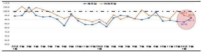 비제조업 BSI는 2023년 12월 100.5를 기록한 이후, 1월(95.2), 2월(92.9) 연속 부진세를 보였다. 제조업 BSI는 2022년 4월(94.8)부터 23개월 연속 기준선을 하회하고 있다.