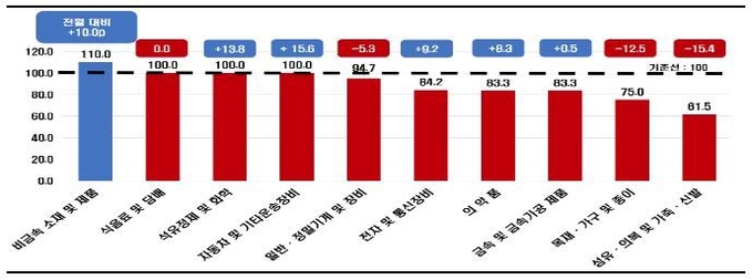 제조업 세부 업종 중에는 비금속 소재 및 제품(110.0)이 유일하게 호조 전망을 보였다. 3개 업종(식음료 및 담배, 석유정제 및 화학, 자동차 및 기타운송장비)이 기준선 100.0에 걸쳤지만 나머지 6개 업종은 업황 부진이 전망된다.