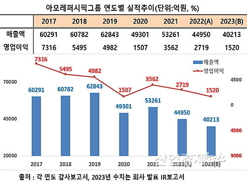 [엔트로피타임즈 민혜정 기자] 아모레퍼시픽그룹(아모레G)의 지난해 영업실적이 전년대비 외형과 손익 모두 감소하는 저조한 성적표를 투자자와 시장에 내밀었다.