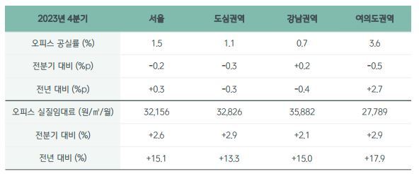 2023년 4분기를 살펴보면 오피스 평균 명목임대료는 제곱미터당 34,472원으로 전 분기 대비 1.6% 상승했고, 평균 실질임대료는 전 분기 대비 2.6% 상승한 제곱미터당 32,156원을 기록했다. 공실률은 1.5%로 전 분기 대비 0.2% 하락했다. 권역별로는 강남권역이 0.7%로 가장 낮았고, 도심권역 1.1%, 여의도권역 3.6%를 나타냈다.