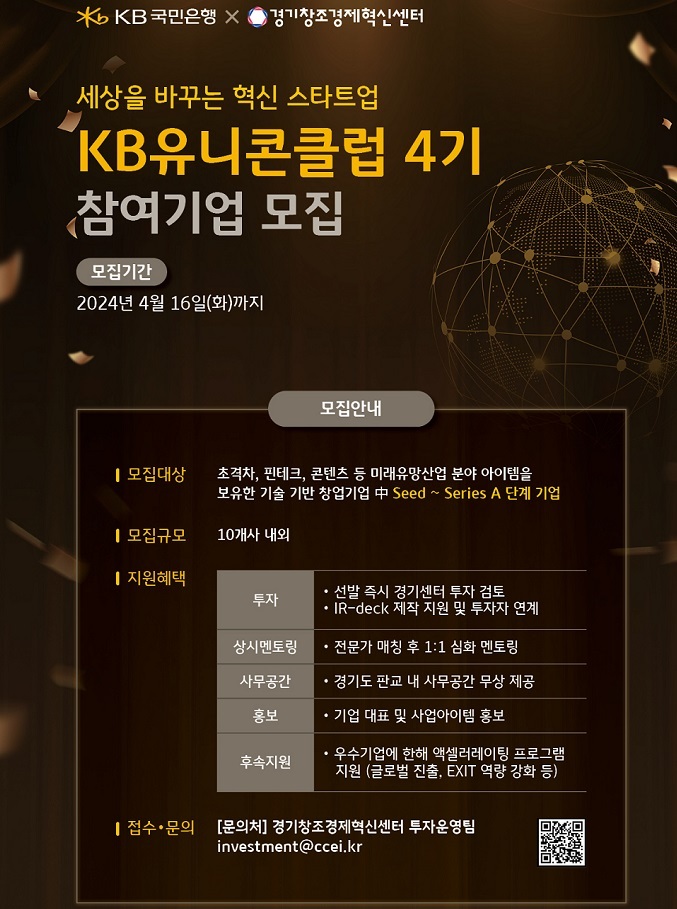 [엔트로피타임즈 김명인 기자] KB국민은행(은행장 이재근)이 지속가능한 사회를 위한 상생금융 실천의 일환으로 新산업 스타트업을 발굴·육성하는 'KB 유니콘 클럽' 4기를 모집한다.