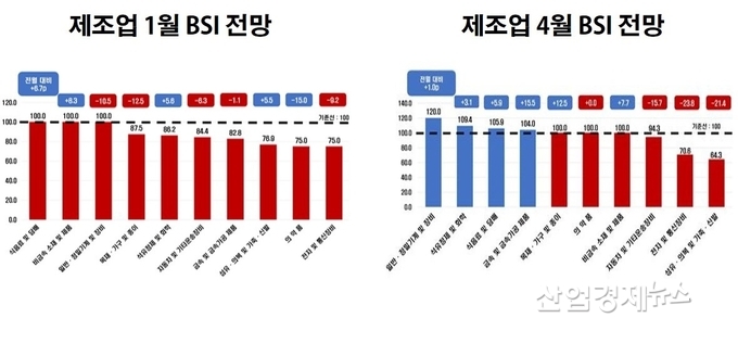 4월 업종별 BSI는 제조업(98.4)과 비제조업(98.9) 모두 아직은 기준선 아래에 머물렀다. 제조업 BSI는 지난 3월(100.5) 24개월만에 기준선 100을 초과했으나 한달만에 다시 기준선 아래로 하락했다. 하지만 비제조업 BSI는 전월(93.5) 대비 5.4포인트 상승하면서 98.9를 기록해 전체 평균치를 끌어 올렸다.
