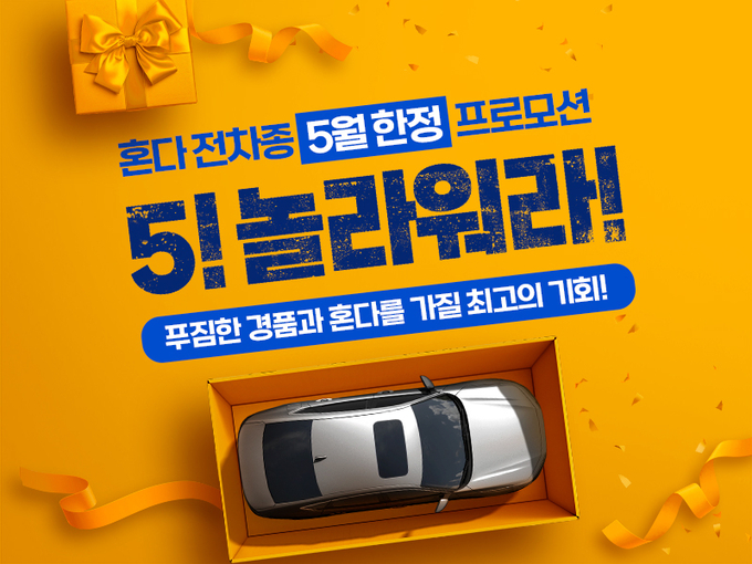 최대 혜택으로 차량을 구매할 수 있는 5월 프로모션으로는 패밀리 미니밴 오딧세이(2023년식) 구매 시 휴가비 700만원 지원 또는 무이자 할부 혜택 중 선택할 수 있으며, 어코드 하이브리드(2023년식) 구매 시 주유비 400만원 지원 또는 무이자 할부 혜택을 제공한다. 어코드 터보(2023년식) 구매 고객의 경우 주유비 300만원을 지원받거나 무이자 할부 혜택을 받을 수 있다. CR-V 하이브리드2WD와 CR-V 하이브리드4WD의 경우 각각 주유비 200만원, 100만원을 지원한다.