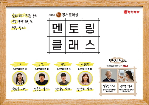 멘토링 클래스는 글쓰기에 도전해보고 싶은 이들을 대상으로 체계적인 창작 입문을 돕고자 마련한 온라인 강의 프로그램. 3일부터 4주 동안 펼쳐지며, 국내 유명 작가들이 문학상의 4개 응모 분야별(시·소설·수필·아동문학)로 글쓰기의 기초부터 실전까지 창작 노하우를 전달한다.