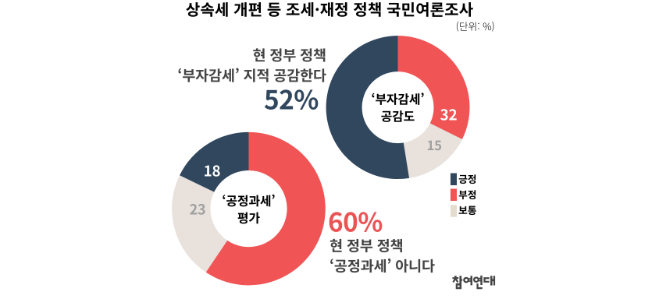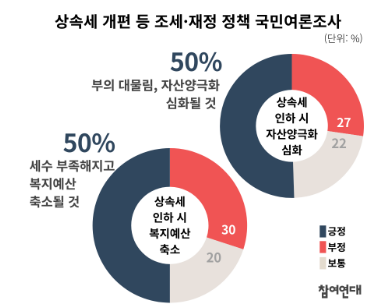 여론조사 결과는,「상속세 최고세율 인하(50% > 30%)에 반대한다 48%, 상속세 인하가 부의 대물림과 자산 양극화 심화는 물론, 세수 부족과 복지예산 축소로 이어질 수 있다 50%」를 나타냈다.