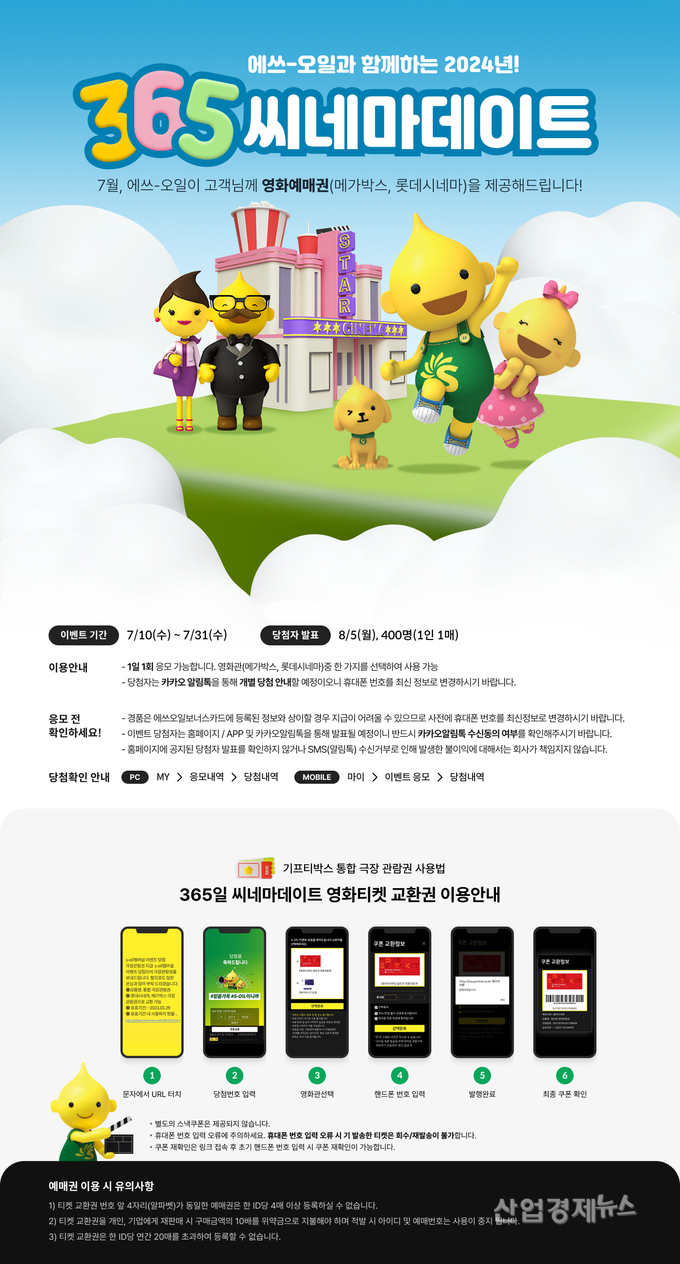 해당 이벤트는 S-OIL 보너스카드 회원을 대상으로 진행되며 S-OIL 보너스카드 홈페이지(s-oilbonus.com)나 보너스 카드 앱(MY S-OIL)에서 1일 1회 응모 가능하다. 당첨시 영화관(메가박스, 롯데시네마) 중 한 가지를 선택하여 사용할 수 있다. 7월 이벤트 기간은 7월 10일부터 7월 31까지이며, 당첨자 발표는 8월 5일 400명 규모이다.