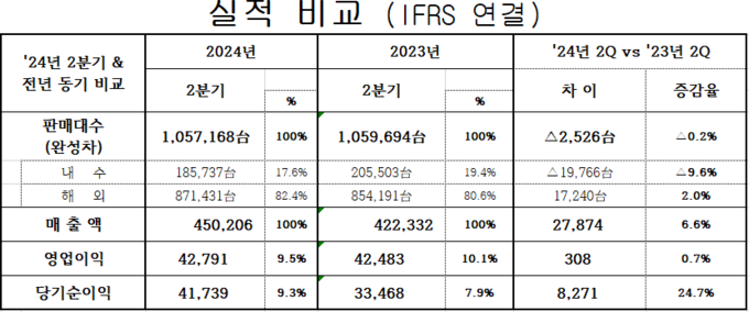 2분기 매출액은 전년 동기 대비 6.6% 증가한 45조 206억원을 기록했다. 선진 시장 및 고부가가치 차종 중심 판매 호조에 따른 믹스 개선, 우호적인 환율 등에 힘입어 역대 분기 최대 매출액을 달성했다.(※기존 매출액 최대는 2023년 2분기 42조 2,332억원) 2024년 2분기 원·달러 평균 환율은 전년 동기 대비 4.3% 증가한 1,371원을 나타냈다.