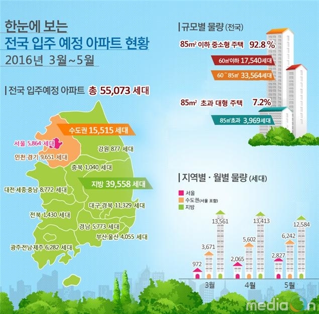 (미디어온) 국토교통부는 오는 3월부터 5월까지(3개월간) 전국 입주예정 아파트는 총 55,073세대(조합 물량 포함)로 집계되었으며, 지역별로는 수도권 15,515세대(서울 5,864세대 포함), 지방 39,558세대가 각각 입주하는 것으로 조사되었다고 밝혔다.