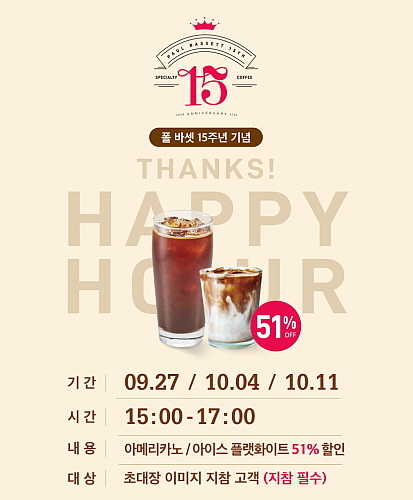 ‘해피 아워’ 이벤트는 매주 금요일 15시~17시에 진행되며, 15주년의 숫자 15를 뒤집어, 51% 할인해 주는 이벤트다. 이벤트 음료는 가장 대중적인 메뉴인 아메리카노와 최근 선보인 아이스 플랫화이트로 선정했다.