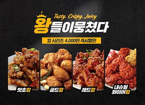 행사 대상 ‘킹 시리즈’는 ▲바삭 쫀득한 치킨에 매콤 짭쪼름한 소스가 어우러진 ‘맛초킹’, ▲숙성 간장과 달콤한 꿀의 조합 ‘골드킹’, ▲핫칠리페퍼와 마늘 토핑을 더해 화끈한 매운 맛을 선사하는 ‘레드킹’, ▲매콤한 오일 소스로 깊은 풍미를 더한 ‘내슈빌 퐈이어킹’ 등 4종이다.