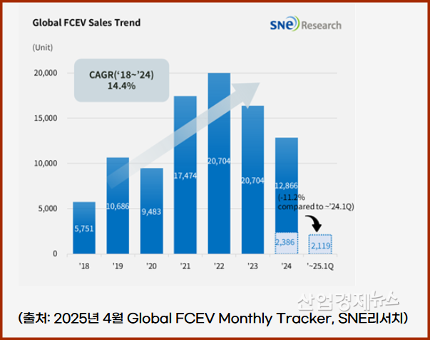 ![2025년 1분기 글로벌 수소차 판매량은 전년 동기 대비 11.2% 감소한 2119대로 집계됐다. [자료= SNE리서치]](http://biznews.mediaon.co.kr/data/photos/20250623/art_17488432581612_2c9cfc.png)