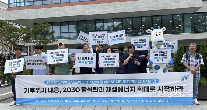 ![지난 6월 25일 오전, 서울 국정기획위원회 앞에서 열린 기후위기 대응 시민사회 기자회견에서 참가자들이 '2030 탈석탄'과 재생에너지 확대를 촉구하는 피켓을 들고 있다. [사진=화석연료를 넘어서(KBF)]](http://biznews.mediaon.co.kr/data/photos/20250626/art_17509250524181_76f018.png)