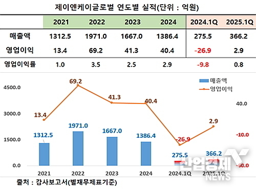 이러한 배경을 가진 '제이엔케이글로벌'의 감사보고서와 올 1분기 보고서에 의거해 2021년부터 약 4년 여간 별도재무제표기준 매출을 살펴보면, 2021년 1312억, 2022년 1971억으로 최대치를 찍은 후 2023년 1667억, 2024년엔 1386억 원으로 급감하며 2021년 수준으로 회귀했다.
