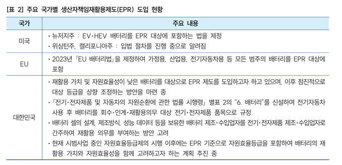 ![폐배터리 재활용을 위한 노력은 국가를 가리지 않고 진행되고 있다. 자료는 주요국가별 생산자책임재활용제도 도입 현황.[자료=국립환경과학원]](http://biznews.mediaon.co.kr/data/photos/20250832/art_17543744665285_e11197.png)