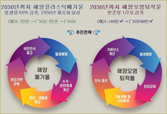 다양한 지자체의 행보에 화답하듯 정부 역시 해양쓰레기 저감을 위한 정책을 적극적으로 도입하고 있다. 해양수산부는 2021년 발표한 ‘제1차 해양폐기물 및 해양오염퇴적물 관리 기본계획’을 통해, 해양 플라스틱 폐기물을 2030년까지 60% 감축하고 2050년까지 제로화하겠다는 목표를 제시했다.