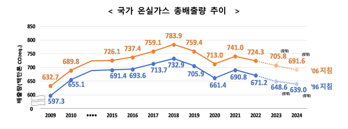 이번 2024년도 잠정배출량은 파리협정에 따른 새로운 기준인 2006 기후변화에 관한 정부간 협의체 산정지침과 ‘2030 국가 온실가스 감축목표(NDC)’ 이행점검을 위한 1996 아이피시시(IPCC) 지침을 적용하여 병행 산정됐다.