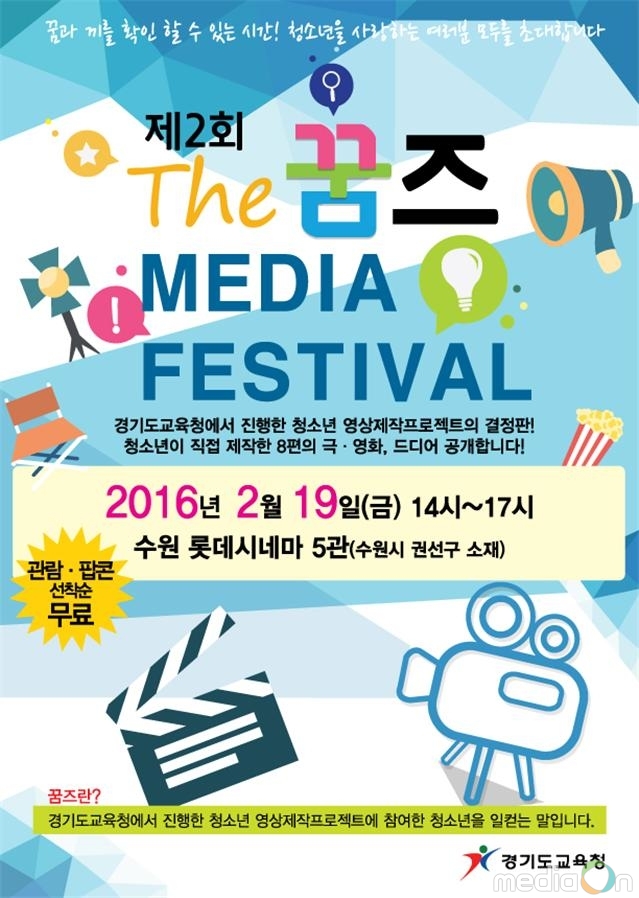 (미디어온) 경기도교육청은 오는 19일 오후 2시 수원역 롯데시네마에서 ‘제2회 꿈즈 미디어 페스티벌’을 개최한다고 밝혔다.
