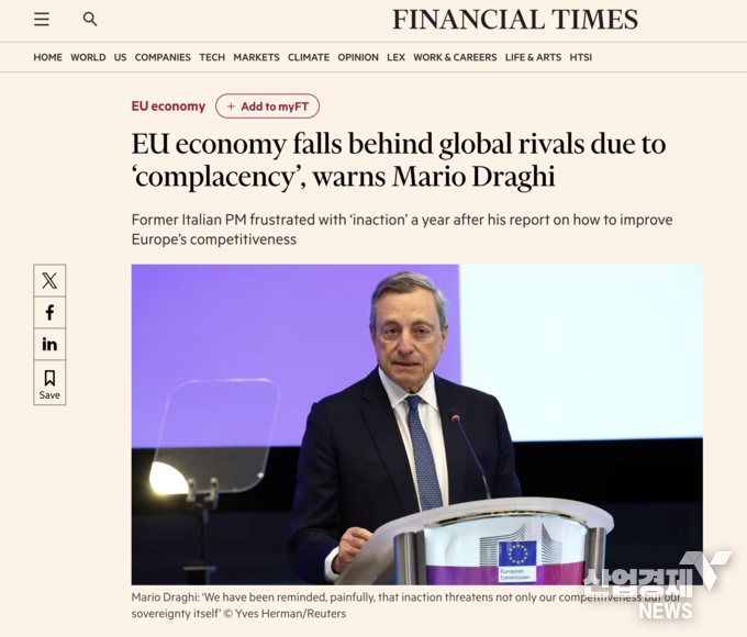 또 최근 몇 년간 EU의 경제성장이 크게 둔화되고 있으며, 미국을 포함한 주요 경제국과의 격차가 확대되고 있다는 점도 지적했다. 그는 특히 “이는 지정학적 격변과 위기뿐만 아니라, 성장하는 중국과의 경쟁, 워싱턴의 이해관계 변화, 러시아의 에너지 자원 손실, 그리고 디지털 혁명에 따른 손실 때문일 수 있다”고 설명했다.