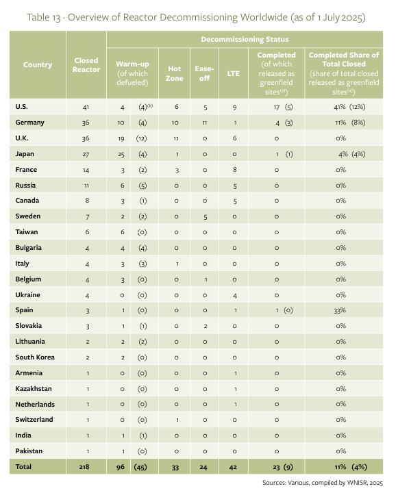 2025년 7월 기준으로 폐쇄된 원자로는 총 218기이며, 해체가 완료된 원자로는 총 21기로 미국 16기, 독일 4기, 일본 1기뿐이다. 나머지는 해체 중이거나 계획 단계에 머물러 있다. 평균 해체 기간은 10~15년, 비용은 원자로 1기당 약 1~1.5조 원에 달한다.