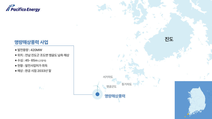 명량해상풍력은 퍼시피코 에너지 코리아가 개발 중인 3.2GW 진도 해상풍력 발전단지 클러스터의 1단계 사업으로, 단일 지역에서 단일 개발사가 추진하는 해상풍력 단지로는 아시아태평양 최대 규모다. 클러스터는 명량(420MW), 만호(990MW), 진도바람(1.8GW) 등 3개 단지로 구성된다.