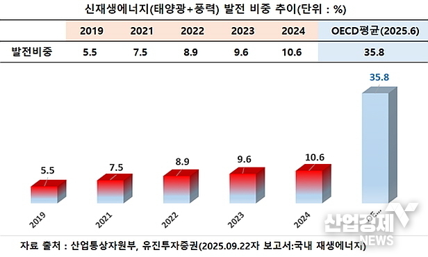 산업통상부자료와 유진투자증권 리서치센터 보고서(2025.9.22.자)에 따르면 우리나라 재생에너지 발전 비중은 2019년 약 5.5%에서 2021년 7.5%, 2022년 8.9%, 2023년 9.6%, 2024년 10.6%로 약 5년 동안 5.1%P증가에 그쳤다.