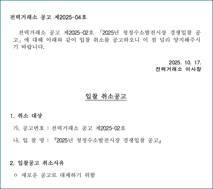 ![전력거래소는 지난 17일 '2025년 청정수소발전시장 경쟁입찰 공고'를 취소한다고 밝혔다. [자료=전력거래소]](http://biznews.mediaon.co.kr/data/photos/20251043/art_17611138082183_d8700f.png)