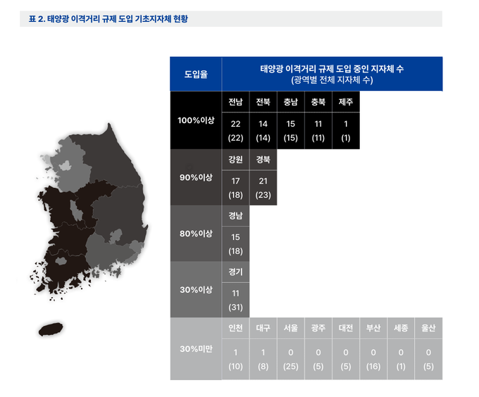 ![전국 지자체 중 129개 지역이 이격거리 규제를 채택할 정도로 널리 보급되고 있지만 그것이 태양광 발전의 발목을 잡을 수도 있다. 자료는 전국 지자체 도입현황. [자료=기후솔루션]](http://biznews.mediaon.co.kr/data/photos/20251145/art_17624997164809_a00e82.png)