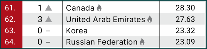 반면 미국은 65위, 러시아는 64위로 한국과 함께 최하위권에 머물렀다. 중국은 54위로 중하위권에 위치했다. 녹색 기술에서는 선도적이지만 화석연료 중심의 에너지 구조가 발목을 잡고 있다는 지적이다.