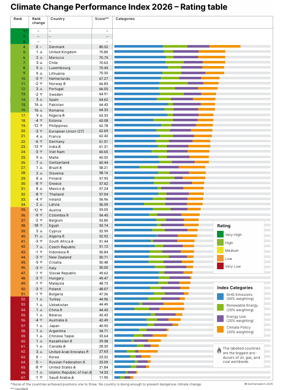 이 같은 결과는 지난 11월 18일, 독일 본(Bonn)에서 열린 COP28 연계 행사에서 발표된 ‘기후변화대응지수 2026(Climate Change Performance Index 2026, CCPI)’ 보고서를 통해 드러났다. 독일의 환경단체 저먼워치, 뉴클라이밋, 기후행동네트워크(CAN)가 공동으로 발표한 이 보고서는 파리기후협약 채택 10주년을 맞아 전 세계 주요국의 기후 대응 성과를 종합적으로 평가했다.