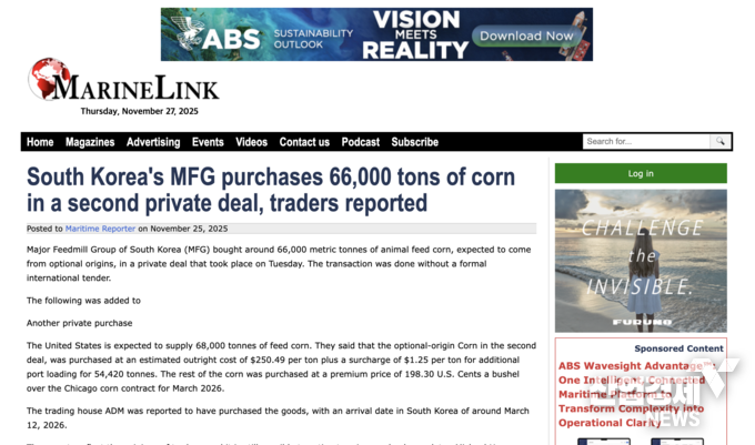 <로이터통신>은 27일 “MFG는 미국의 농산물 무역회사 카길(Cargill)이 판매한 동물용 사료를 C&F 조건으로 구매했으며, 항구 하역 추가에 따른 톤당 1.50달러의 추가 요금이 부과된 것으로 확인됐다”며 이 같이 보도했다.
