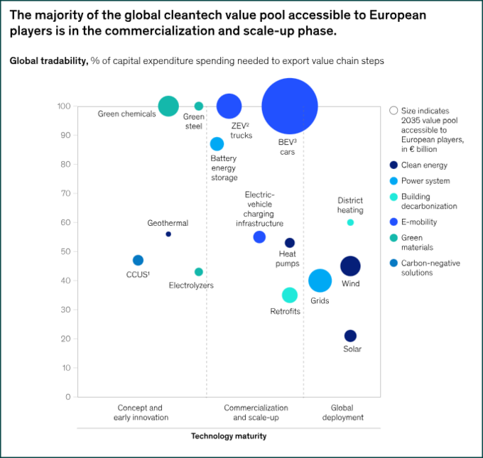 [엔트로피타임즈 손영남 기자] 유럽이 기후위기 대응과 지속가능한 성장을 동시에 달성하기 위해서는 클린테크, 즉 깨끗한 기술에 대한 대담한 확장과 빠른 상용화가 필요하다는 분석이 나왔다. 글로벌 컨설팅 기업 맥킨지앤드컴퍼니(McKinsey & Company)는 지난 11월 25일 발표한 보고서를 통해 2035년까지 클린테크 분야에서 연간 5조 유로 규모의 투자가 이뤄질 것이라며, 유럽이 이 시장에서 뒤처지지 않으려면 과감한 전략적 선택이 불가피하다고 강조했다.