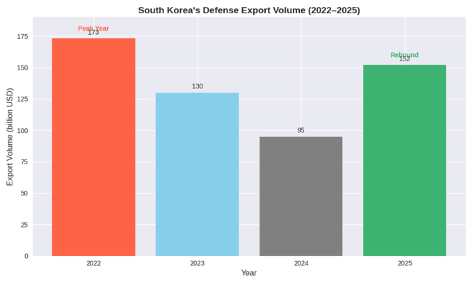 최근 5년간 한국 방산 수출 규모는 가파른 성장세를 보였다. 국회예산정책처(NABO)에 따르면 2020년까지 연평균 약 30억 달러 수준이던 수출액은 2022년 173억 달러를 기록하며 역대 최고치를 달성했다. 이후 2023년, 130억 달러로 조정 국면을 거쳐 2024년 95억 달러로 일시적으로 주춤한 뒤 2025년에는 다시 반등해 152억 달러(약 22조 원)를 기록했다. 이는 전년 대비 60% 이상 증가한 수치로, 단기 호황을 넘어 구조적 성장 국면에 진입했음을 보여준다.