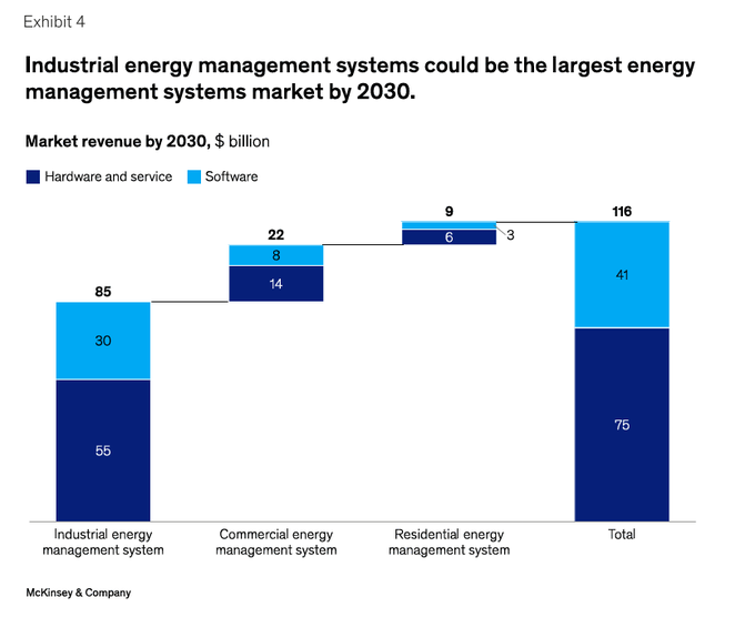 맥킨지의 분석에 따르면 산업, 상업, 주거용을 아우르는 EMS 글로벌 시장은 2030년까지 약 1,160억 달러 규모에 이를 것으로 예상된다. 특히 산업용 EMS가 전체 시장의 70%를 차지하며, 소프트웨어만으로도 약 410억 달러 규모에 이를 것으로 전망된다. 실제로 소프트웨어의 비중은 2024년 27%에서 2030년 35%로 확대될 것으로 보이며, 하드웨어와 서비스의 비중은 상대적으로 줄어들 것으로 예상된다.