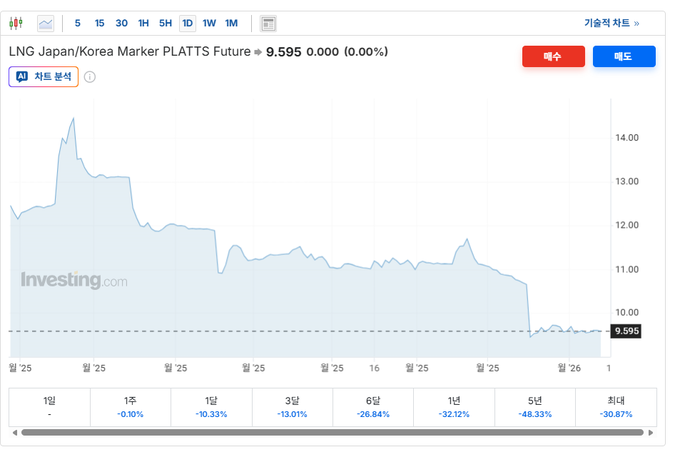 ![JKM(Japan Korea Marker)는 S&P Global Platts가 산출하는 LNG 벤치마크 가격으로 실질적인 북동아시아 LNG 가격 지표로 쓰이고 있다. 현재 9달러 중반까지 떨어지며 최근 하락세를 보여주고 있다. [자료=Investing.com]](http://biznews.mediaon.co.kr/data/photos/20260103/art_17684636242423_14cc17.png)
