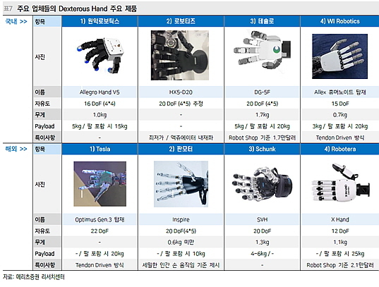 여기에 로봇 손(Dexterous Hand) 또한 더욱 사람처럼 행동하기 위해 15~24 자유도 수준까지 진화, 액츄에이터의 중요도가 재차 강조되며, 손가락 관절의 공간적 제약 해소와 소형 액츄에이터의 낮은 악력을 극복하는 것이 주요 과제로 제시되고 있어 액츄에이터의 추가적인 소형화/경량화가 필요한 상황이라고 덧붙였다.